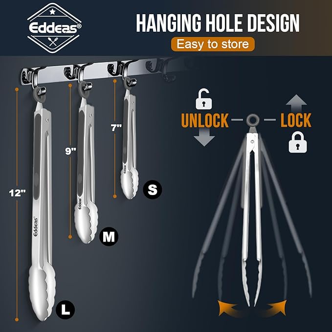- FOOD LEVEL STAINLESS STEEL: kitchen tongs The heavy duty EDDEAS kitchen tongs built with stainless steel, sturdy, heat resistance, anti-rust, anti-corrosion, light weight, easy to handle like new forever. This tongs for cooking comes with a set of 3, standard7"Serving Food Tongs 9" cooking tongs and large sized 12" BBQ grill tongs.