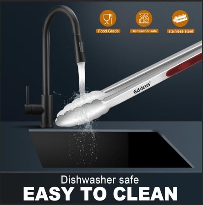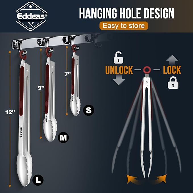 - FOOD LEVEL STAINLESS STEEL: The heavy duty EDDEAS kitchen tongs built with stainless steel, sturdy, heat resistance, anti-rust, anti-corrosion, light weight, easy to handle like new forever. This tongs for cooking comes with a set of 3, standard7"Serving Food Tongs 9" cooking tongs and large sized 12" BBQ grill tongs.
