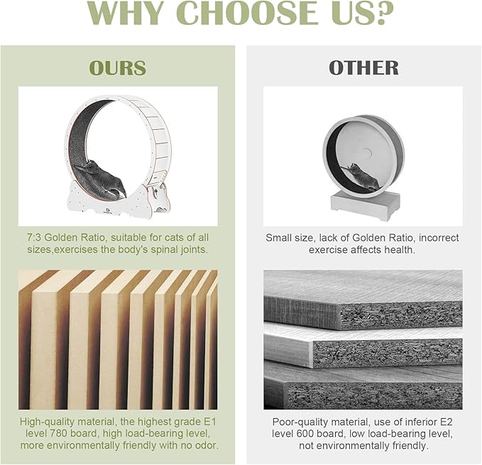 - Noise Reduction and Safety Design: upgraded TPE silent roller make the treadmill run quieter, with the locking device, you can set specific playtimes of the day or night without causing trouble to the neighbors. The base edge has the same height as the wheel edge, and only a 5mm gap between them, which can not only ensure the smooth running of this large wheel but also avoid the risk of the cat pinching its feet when walking and rolling in it, ensuring the safety of your cat