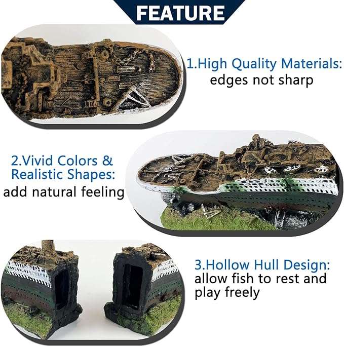 - High-quality material: this aquarium ornament is made of resin material,which is safe and non-toxic so it can be used safely in aquarium,no matter fresh or seawater;this Titanic ship serve as home that offers them a feel of their natural and living environment where they can swim around, hide or play;this add more fun to their lives and helps to relieve stress