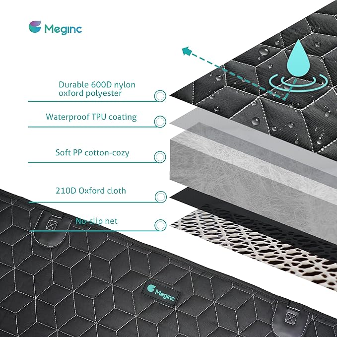 - Sturdy Material : HEAVYDUTY! HEAVYDUTY! HEAVYDUTY!Meginc dog back seat cover is made of 600D Oxford cloth, 100g soft PP cotton, 210D polyester fabric, 100% waterproof TPU and PVC anti-slip mesh. A thick pet seat cover can mitigate the damage of your vehicle and protect carpet, upholstery from unpleasantries such as dog hair, urine, or vomit, moreover our protectors also providing a familiar, comfortable and safety space for your pets during the road travel.