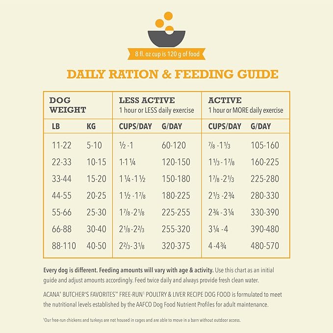 - One (1) 4 lb bag of ACANA Butcher's Favorites Free-Run Poultry* & Liver Recipe Dry Dog Food