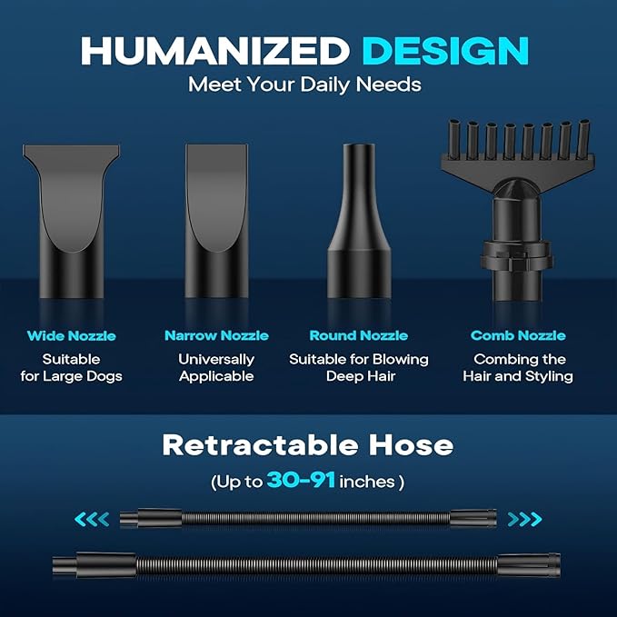 - 【CONSIDERATE DESIGN】Our dog dryers have a thickened metal housing and noise reduction construction, making them 5-15 decibels less noisy than other products when used. It won't scare your dog. In addition, the thickened composite hose is resistant to high temperatures, stretchable, and flexible to use. So even if your dog likes to wiggle when grooming, you can easily finish.