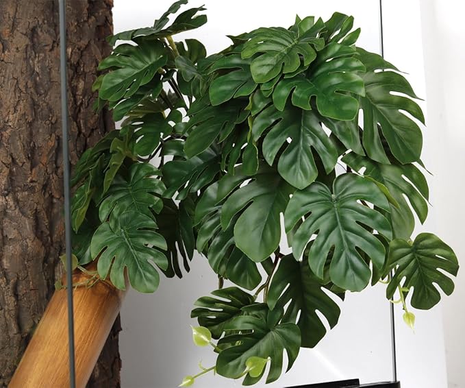 2Pack Reptile Fake Plants for Terrarium, Snake Tank Accessories, Habitat Decor Artificial Hanging Plants with Suction Cup - Fake Monstera