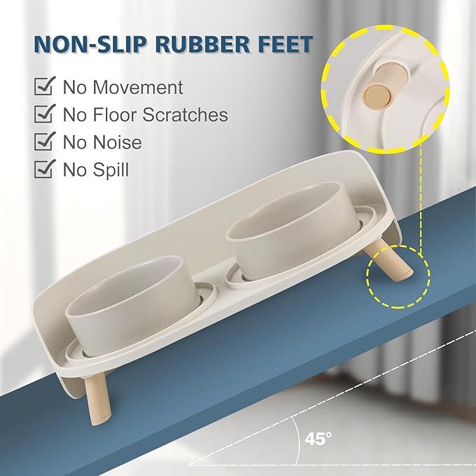 - No More Messy Floors - The raised cat bowl set with a splash proof guard that helps to prevent the spills or messes splashing out, saving your time on mopping and wiping. The bottom of each leg is equipped with non-slip rubber to prevent sliding when pets are eating and protect your floors.