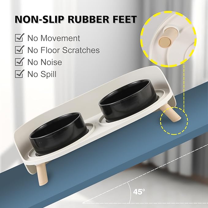 - No More Messy Floors - The raised cat bowl set with a splash proof guard that helps to prevent the spills or messes splashing out, saving your time on mopping and wiping. The bottom of each leg is equipped with non-slip rubber to prevent sliding when pets are eating and protect your floors.