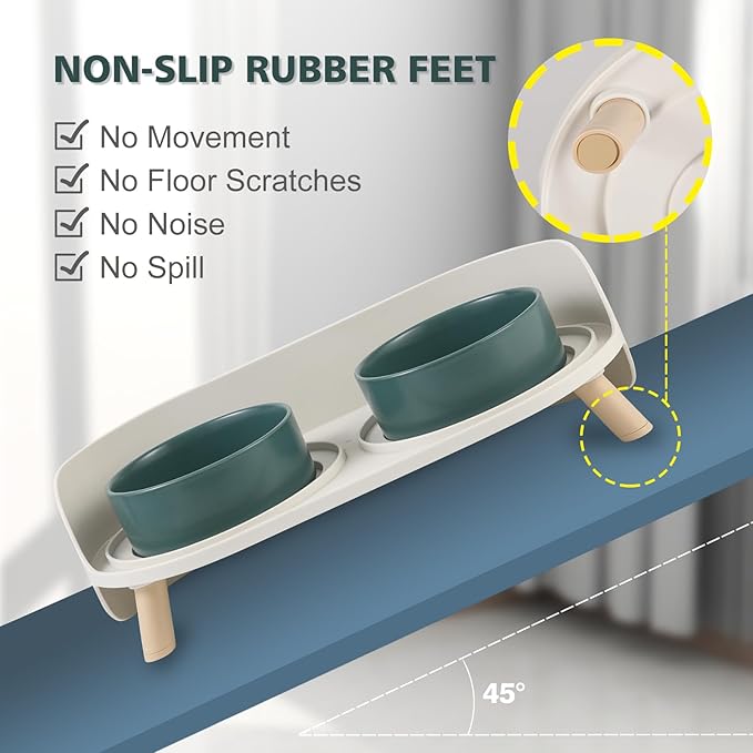 - No More Messy Floors - The raised cat bowl set with a splash proof guard that helps to prevent the spills or messes splashing out, saving your time on mopping and wiping. The bottom of each leg is equipped with non-slip rubber to prevent sliding when pets are eating and protect your floors.
