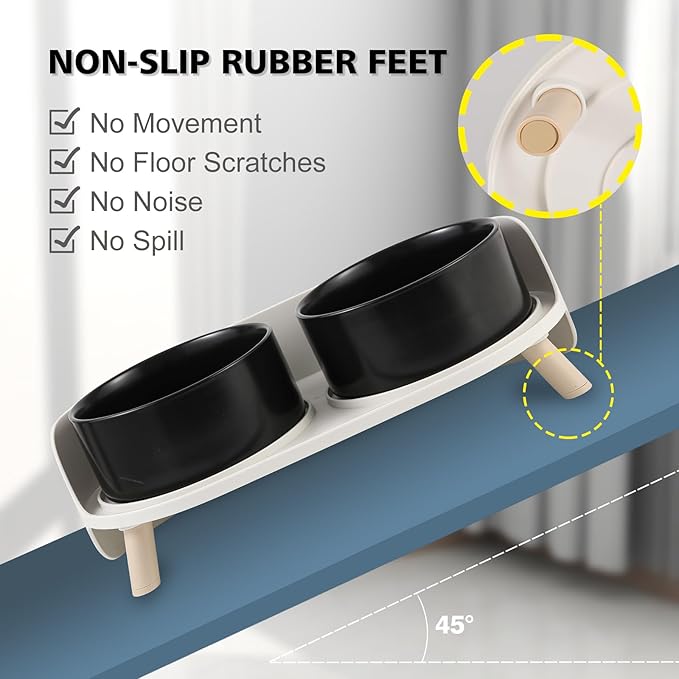 - No More Messy Floors - This raised dog bowl with a splash proof guard which helps prevent the spills or messes splashing to the floor, saving your time on mopping and wiping. The bottom of each leg is equipped with non-slip rubber to prevent sliding when the pets are eating, and provide protection for your floors.