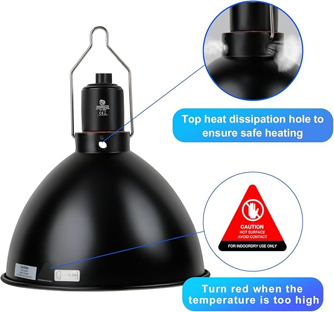 - 【Good Heat Dissipation】:The top vent of heat lamp kit has good heat dissipation effect, this design prevents excessive heat buildup and reduces the risk of reptile burns while providing your reptile pet with basking spot light.