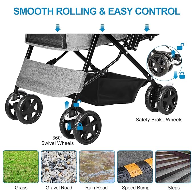 - 【Flexible Wheels for Widely Use】Durable wheels that glide easily over smooth or rough terrain, and the front wheels can rotate 360° without dead ends, you can also turn on the straight walk to achieve a full-featured mobile lifestyle. The rear wheels have safety brake system for easier and safer use. Whether you're exploring the city, visiting parks, or simply going for a leisurely stroll, our pet stroller is the perfect companion for you and your furry friends.