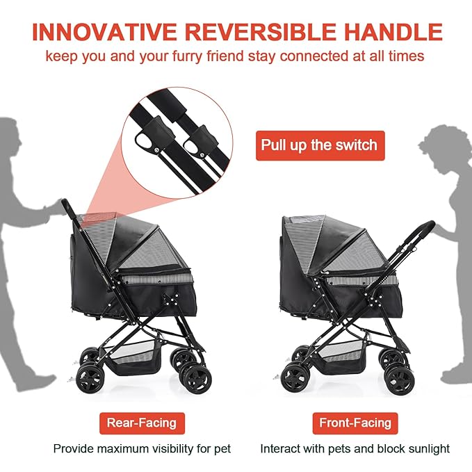 - 【Innovative Reversible Handle】- Enjoy unparalleled convenience with our pet stroller featuring a reversible handle, allowing you to effortlessly switch between rear-facing and forward-facing modes, ensuring you and your furry friend stay connected at all times.