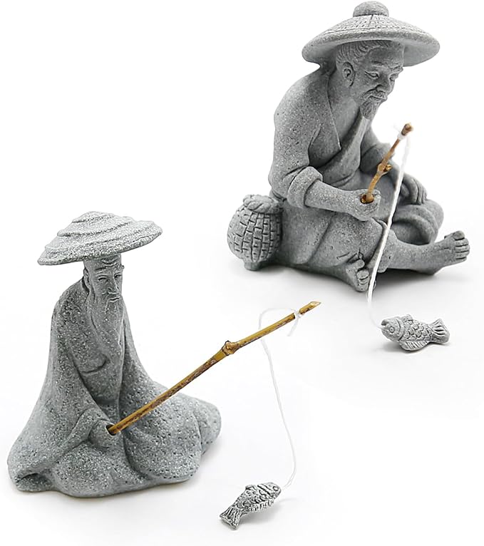 2PCS Sitting Fishing Figurines Sandstone Vintage Ornament Japanese Decor for Fish Tank Pot Garden Home Aquarium Mini Fisherman Statue Asian Zen Decoration