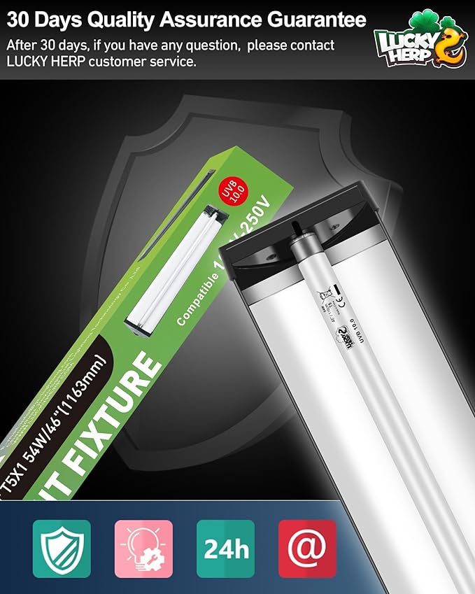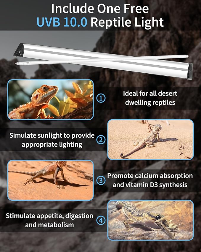 - T5 UVB Lighting Combo Kit - One purchase to meet the lighting needs of your reptile pets. We have carefully matched high-quality T5 reptile light fixture with 10.0 uvb reptile light to provide a perfect lighting environment for your reptile pets. Not only can it maintain the healthy growth of reptile pets, but also stimulate their physical behaviors such as appetite, activity level and reproduction.