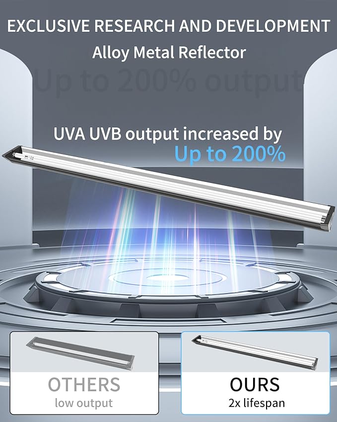 - Unique Alloy Reflective Layer - LUCKY HERP reptile light fixture use an exclusively developed alloy metal reflective layer, which can increase the spectral energy required by reptiles such as UVB and UVA output by the fluorescent lamp by up to 200%, providing enough UVB rays for your reptile pets. Promote calcium absorption and vitamin D3 synthesis, thereby promoting bone health of reptiles. Provide health protection for your pets.