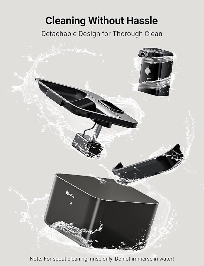 - Cleaning Is A Breeze - DownyPaws cat water fountain wireless is BPA-free and helps prevent pet acne. All parts are easy to assemble and disassemble, makes it super easy to clean every corner without hassle. NOTE: For the spout cleaning, rinse only, don't immerse the battery compartment in water