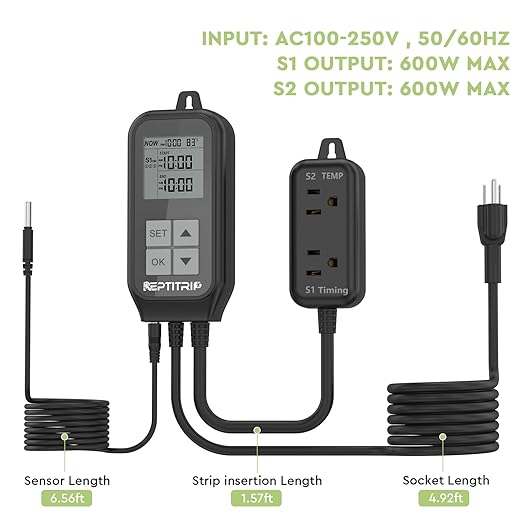 - Timer & Thermostat: Reptile thermostat, equipped with two independently operating sockets. Socket S1 is used for timing control, and Socket S2 is used for day and night temperature control, meeting the temperature and light needs of reptiles and amphibians at different time periods