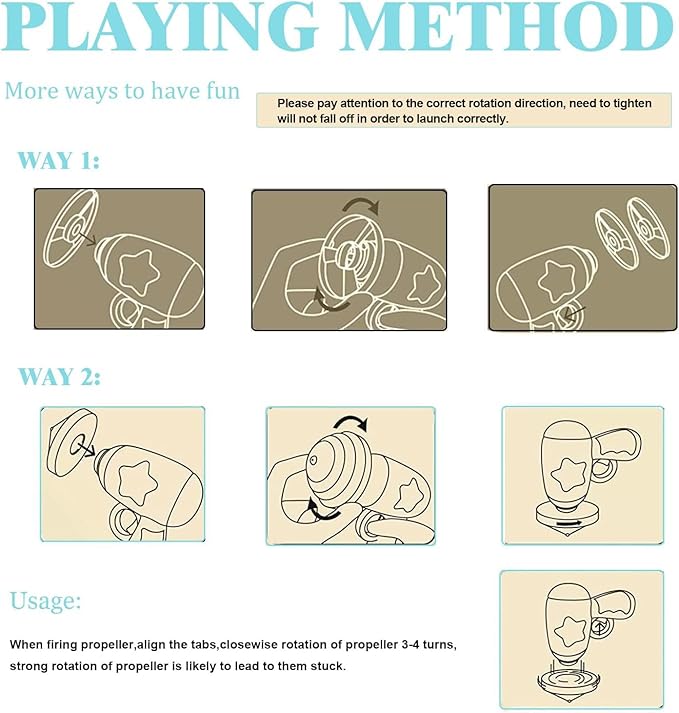 - Easy to play & aim: First install the propeller, turn it clockwise 3-6 times, aim, and pull the trigger to launch, your cat will have great fun with this fetch toy. Please don't rotation the discs excessively, otherwise it will affect the service life of the toy. Supervise pets during play to avoid ingestion of small parts and replace broken toys timely