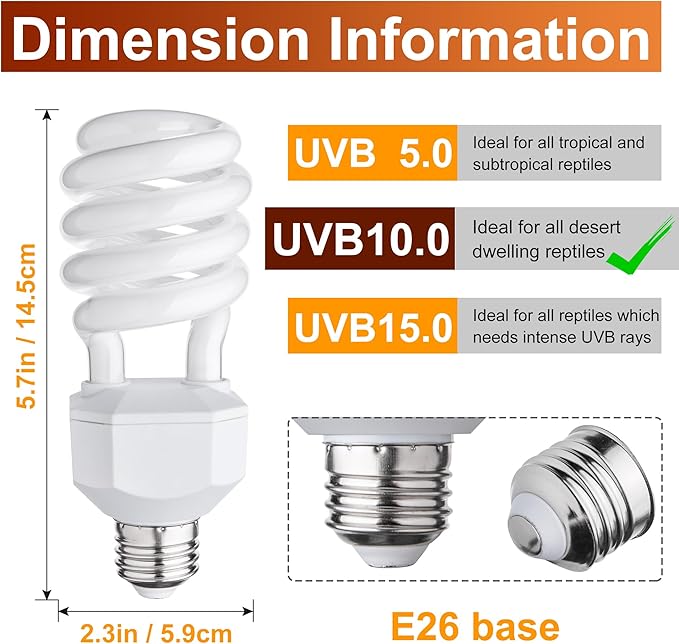 - [Perfect for Desert Reptiles] UVB 10.0 Reptile Light Bulbs are ideal for all desert-dwelling reptiles desert lights, including bearded dragon, tortoises, geckos, snakes, iguanas, lizards, chameleons, frogs, toads & more. Use them to increase natural behaviors and prevent illnesses.