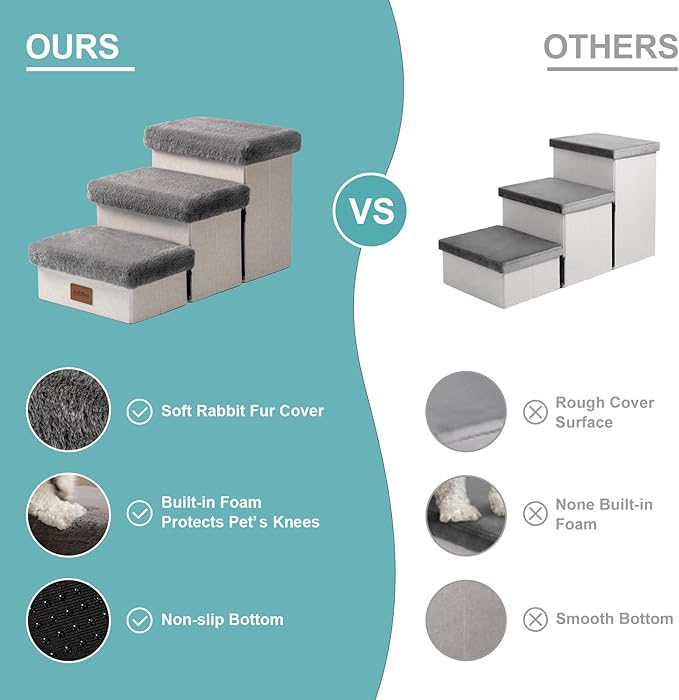 - 【Dog Stair with Storage】NOTE: The stairs are designed for small pets. Each step features a convenient storage space, perfect for storing pet toys, clothes, snacks, and any other pet supplies or accessories. Each step is less than 5 inches high, making it especially suitable for puppies or pets with knee injuries. NOTE: Be sure to verify that the size of the dog stairs is appropriate for your needs before purchasing.