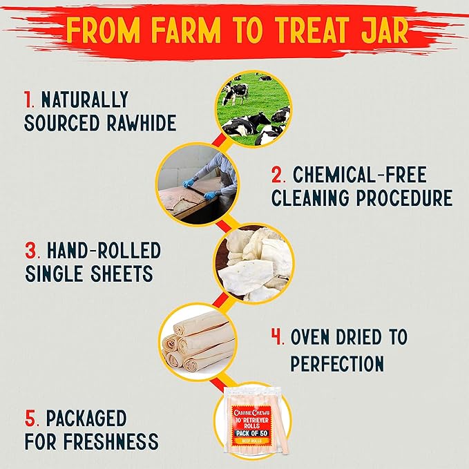 - Premium beefhide - For 25 years our family-owned manufacturer has prided itself on continuing to source high-quality raw hide solely from North America to create our all natural rawhide rolls for dogs. Each jumbo raw hides large dogs is hand-rolled