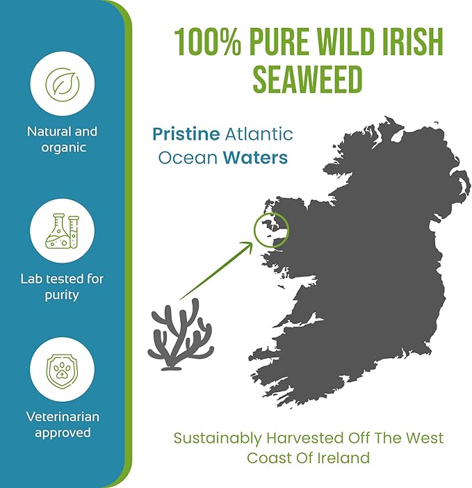 - ✅ Quality Ingredients: Sourced from the untouched Atlantic Ocean waters off the Irish coast, our single-ingredient seaweed for dogs is a pure, wild-harvested treasure. Made from premium brown Irish seaweed, it's not just another product—it's a promise of uncompromising quality. This kelp for dogs is a veritable banquet of essential vitamins and minerals, meticulously chosen to elevate your dog's health to levels you have to see to believe.