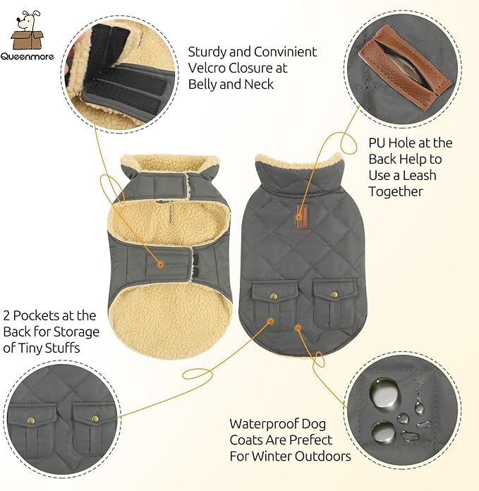 Queenmore Dog Winter Coat - Fleece Jacket, Waterproof Cold Weather Clothes, Thick Warm Cotton Padding, Easy On/Off Storage Pockets (Grey, X-Small)