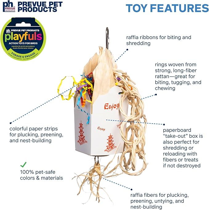 - A takeout carton with cutouts, filled with paper strips to satisfy foraging and nest-building instincts - Replenish with fibers or treats when original contents are depleted