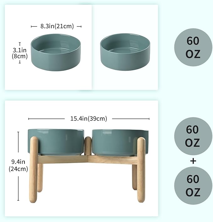 SPUNKYJUNKY Ceramics Elevated Dog Feeding Stand with Wooden Base - Double 60oz Bowls for Medium Large Dogs (Dark Green)