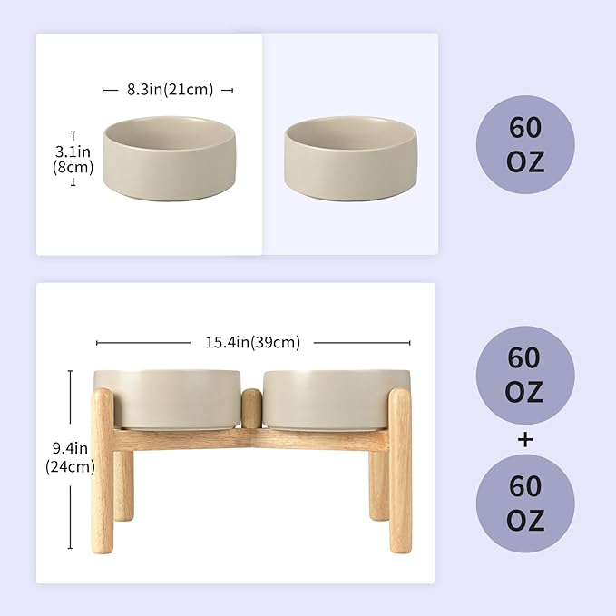 SPUNKYJUNKY Ceramics Elevated Dog Bowls with Wooden Stand Raised Dog Bowl for Medium Large Dog Food and Water Pet Feeding Bowl(Double 60OZ Bowls,Grey)