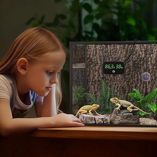 - Installation Breeze: The reptile thermometer is ready to use straight out of the box, with no difficult set-up. This unit is unique in that It comes with an adjustable back stand and has three angles to hover at so you can adjust it to the right viewing angle. It has two mounting options, tabletop stand and 3M adhesive backing stickers. the probe cord is 31.5 inches, great if you have a large tank and need the extra cord length