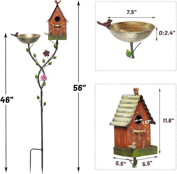 - PERFECT SIZE:The bird baths for outdoors has an overall height of 56 in, and the metal pot size :7.5" D x 2.4" H;metal birdhouse size : 11.6" H x 5.5" W;hole diameter:1.57 inch