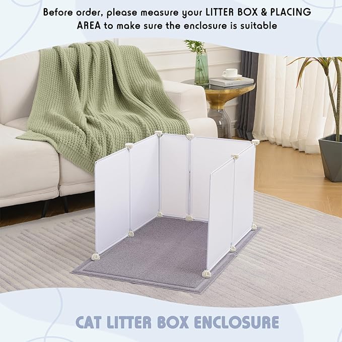 - DIY Splash Guard : It is composed of several sheets and connectors and could be freely matched to install, or spliced into 27.9 x 21.5 x 17.6 in XL litter box enclosure; You could DIY the splash guard shape and size according to the size of your cat litter box