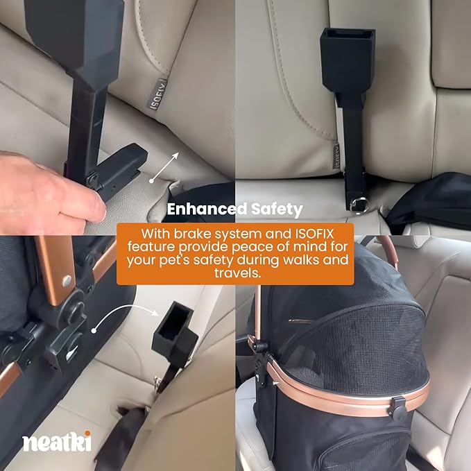 - Enhanced Safety – Equipped with a reliable brake system, this stroller keeps your pet secure and gives you peace of mind during walks and outings. Now featuring ISOFIX for easy vehicle installation, ensuring a safer, stress-free travels with your furry friend.