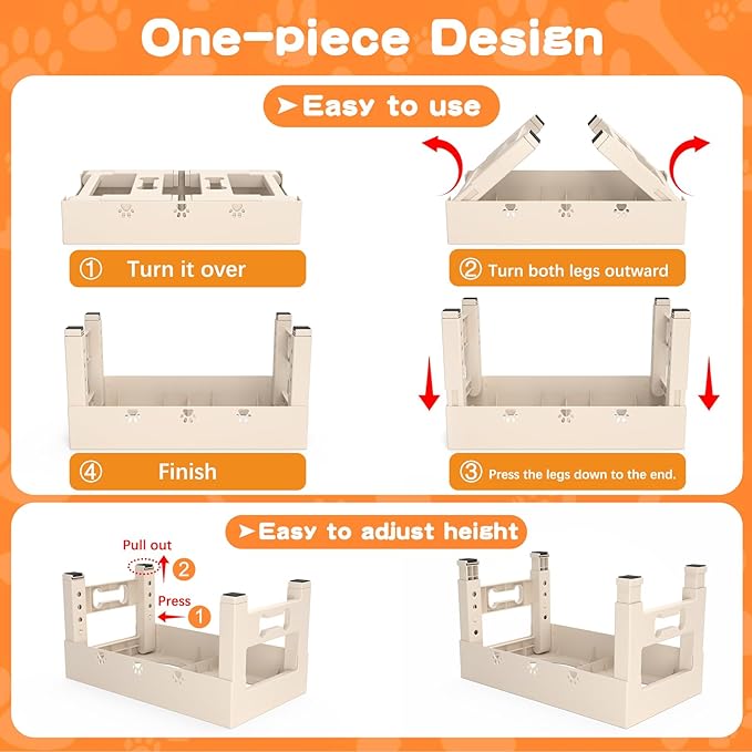 - 🐾【No Installation & Folds Up Nice for Traveling】:The foldable legs make this stand ultra-portable and space-saving for home or travel. No assembly needed—simply unfold the legs, press down, and it’s ready to use! Adjusting the height is effortless: press the white button and pull the legs to your desired height.