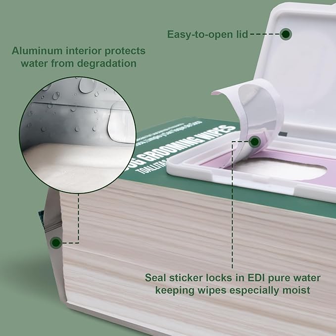 - Aluminum Interior - The aluminum layer effectively locks EDI purified water within the pet wipes, keeping them moist and fresh while preventing any liquid degradation. Enjoy long-lasting, reliable wipes that stay ready to refresh and care for your pet.