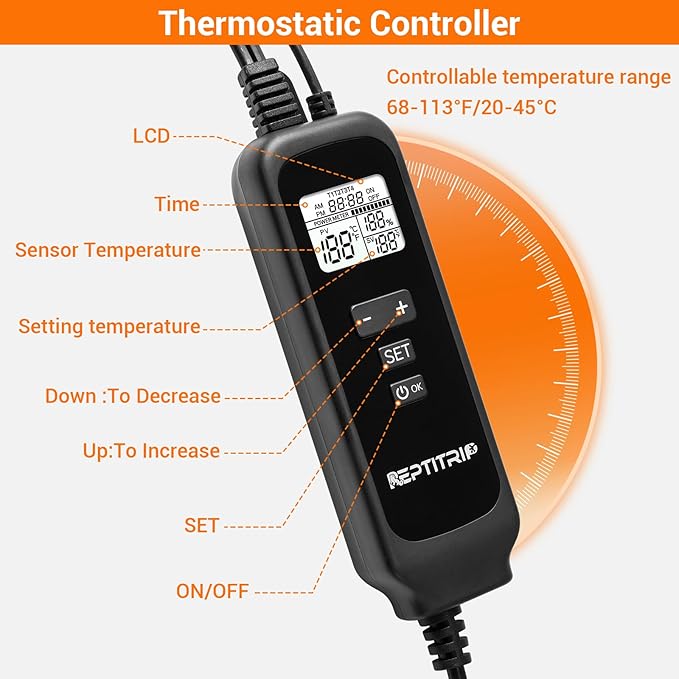 - Reptile Thermostat: Controls the temperature of your reptile's habitat, providing a comfortable temperature that helps keep them healthy and active. Thermostatic control range is 20°C to 45°C (68°F to 113°F).