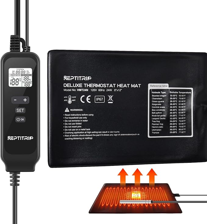 Reptile Heating Pad with PID Thermostat 8"X12" 24W, Reptile Heat Mat for 30-40gal Tank, Heat Pad with High Temperature Protection °F/°C, for Turtle/Snake/Lizard/Frog/Spider/Plant