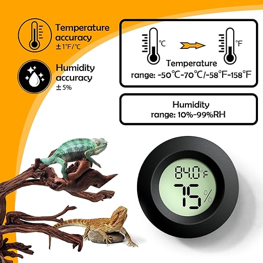 - Fast Response And Accurate Readings: 5 seconds fast sampling response and accurate digital readings updated, which is provided a perfect enclosure for your cute reptile. Reptile thermometer range from -58°F to +158°F(±1°F), humidity range from 10% to 99% RH(±5%).