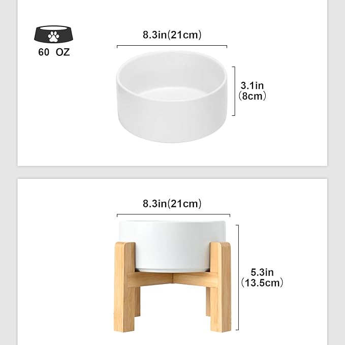 SPUNKYJUNKY Ceramic Elevated Dog Bowls 2 Pack - 8.3inch Raised Dog Bowls with Non-Slip Wooden Stand for Large Dogs Dishwasher Safe(White,60OZ*2)