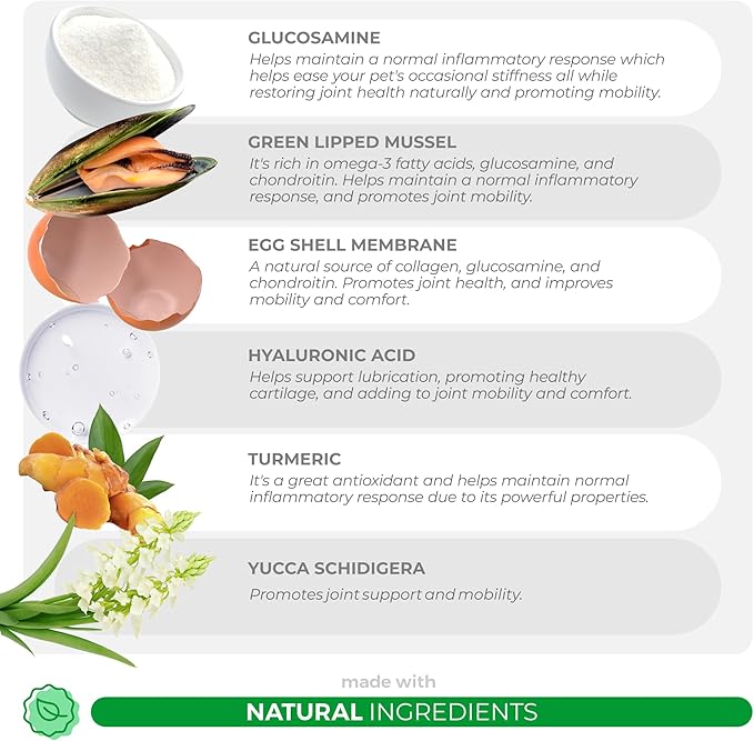 - Advanced Joint Health Formula: Our hip and joint support product for dogs combines powerful ingredients like Glucosamine, Green Lipped Mussel, and Egg Shell Membrane to maintain a normal inflammatory response, revive joint health, and promote joint mobility naturally.