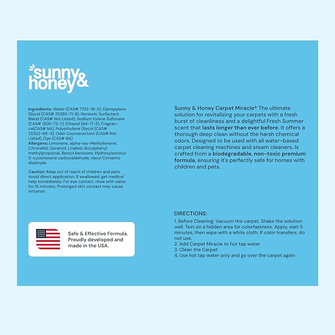 - Sunny & Honey Power Clean: Tackle tough messes with the Sunny & Honey Carpet Miracle, your ultimate carpet cleaner solution. This carpet shampoo and pet carpet cleaner leaves your carpets fresh with a light summer scent