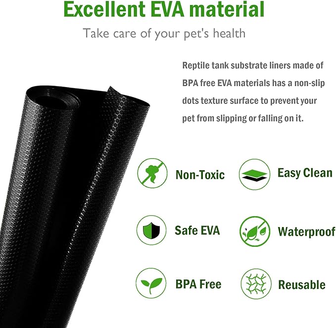 - SAFE AND COMFORTABLE : Non-adhesive and non-abrasive material is gentle on paws, claws and bellies alike. Seamless and textured surface is great for pet because it helps prevent slipping and joint injury. Special thickened EVA material absorbs heat to maintain warmth inside the reptile tank and regulate humidity