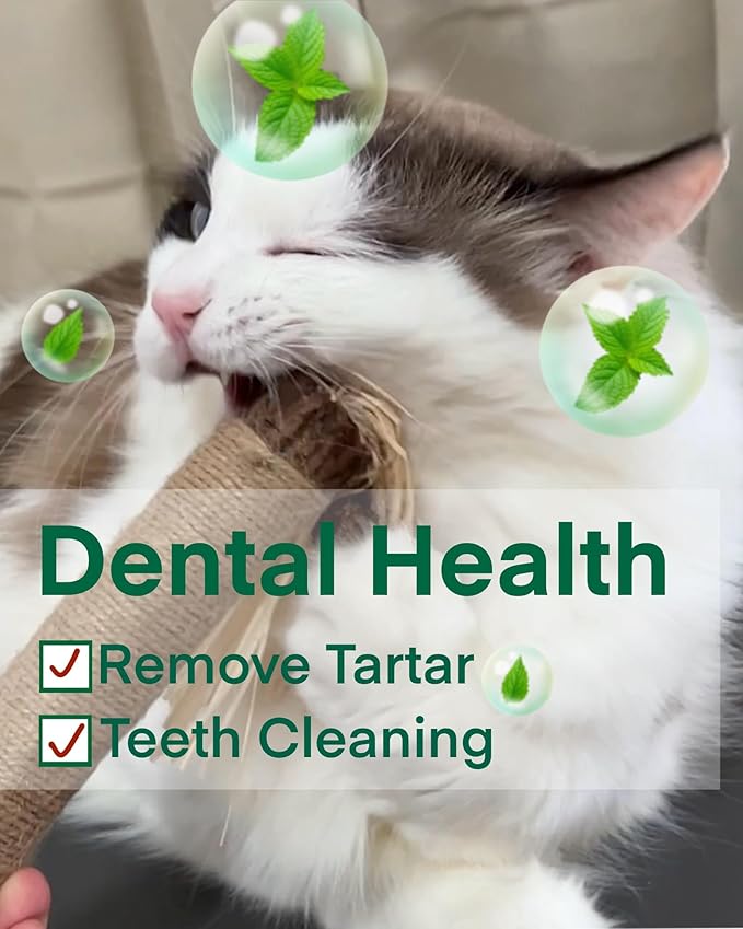 - [Teeth Cleaning] Silvervine and gall fruit are rich in Actinidine and Nepetalactone, enticing your cat and helping them relieve stress. Plus, the natural sisal rope and raffia aid in cleaning teeth, eliminating plaque and tartar, and ensuring excellent oral hygiene and fresh breath