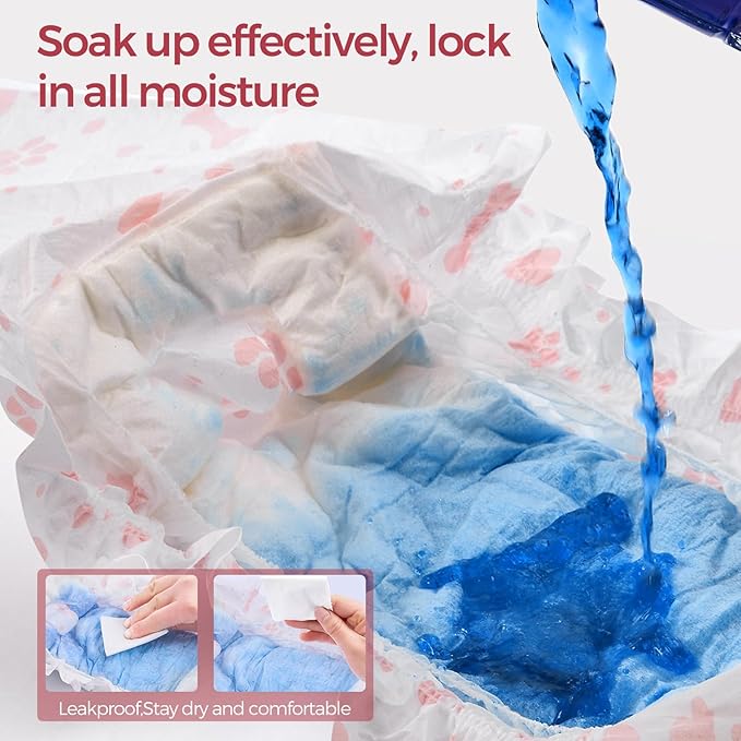 - Super Absorbent, Leak Proof: With a super absorbent polymer, the female dog diapers quickly convert urine into gel, quick dry and locking in moisture. Ensuring dog's fur stays dry. Leak-proof PE backing film gives entire house protection, no longer worry about leaks damaging your carpet, rug, chair, or sofa