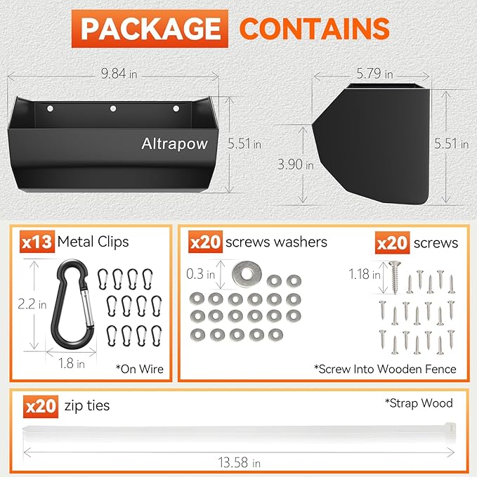 - EASY TO INSTALL AND CLEAN: We will provide three hanging methods of clips, nylon ties and screws for you to install the feed troughs. The feed trough can be hung on the wire fence or mounted on the wall or wood fence. And you only need to use a brush and water to clean the fence feed trough.