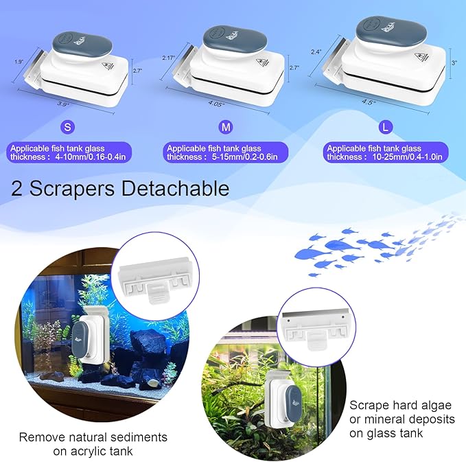 - STRONG MAGNETIC : Made of strong rare earth magnet, durable and convenient. Stronger and more powerful magnetic force. Just move the outer magnet, the inside magnet follows, cleaning the floating algae faster and easier. Size Small suitable for fish tanks with thickness of no more than 1/4", Size Medium suitable for fish tanks with thickness of 1/4 "-3/8 ", Size Large suitable for fish tanks with thickness of 2/5"-4/5"