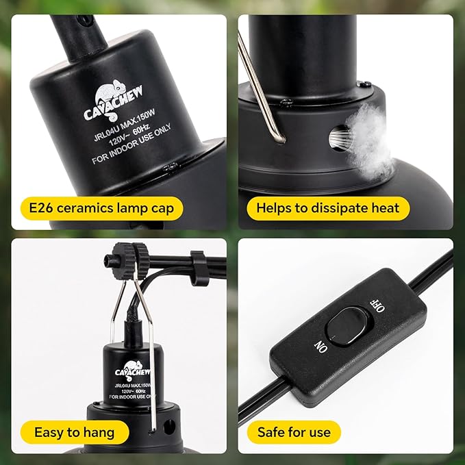 - Easy & Safe for Use: CAVACHEW reptile heat lamp fixture uses independent switches and hooks, easy to install and safe for use. Equipped with heat dissipation holes, which can extend the service life of the bulb.