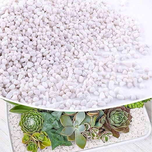- 🌷【White Rocks】: 2/5 inches. These small white rocks are polished, with no sharp edges, ensuring they won't harm plants. They can be spread over the soil surface of plants, serving not only for decoration but also preventing soil losing and aiding in the optimal growth of plants.