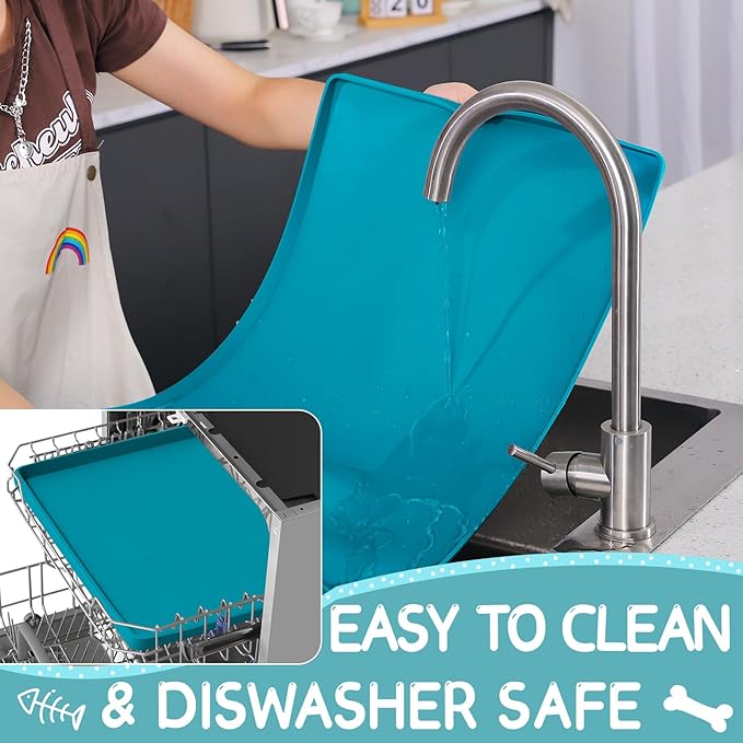 - Easy to Clean & Dishwasher Safe: You can fold the pet bowl mats for food and water to discard crumbs and rinse them down in a sink without deformation. Alternatively, the dog water matt for sloppy drinkers and dog matt for food and water bowl can be wiped down with a wet cloth. The pet water mat for dog bowl is also safe to clean in a dishwasher. If you have energetic pets, you can put the silicone pet food mats waterproof with edge under the pet food bowls every mealtime as they dry up quickly