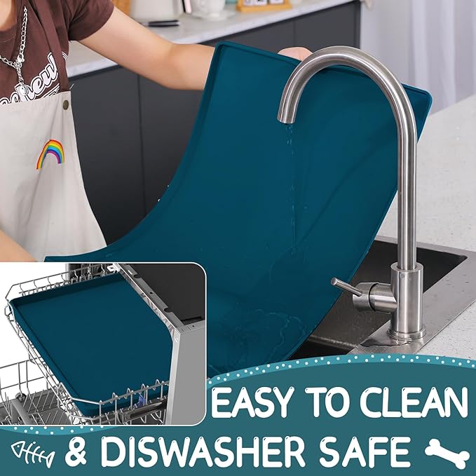 - Easy to Clean & Dishwasher Safe: You can fold the pet bowl mats for food and water to discard crumbs and rinse them down in a sink without deformation. Alternatively, the dog water matt for sloppy drinkers and dog matt for food and water bowl can be wiped down with a wet cloth. The pet water mat for dog bowl is also safe to clean in a dishwasher. If you have energetic pets, you can put the silicone pet food mats waterproof with edge under the pet food bowls every mealtime as they dry up quickly